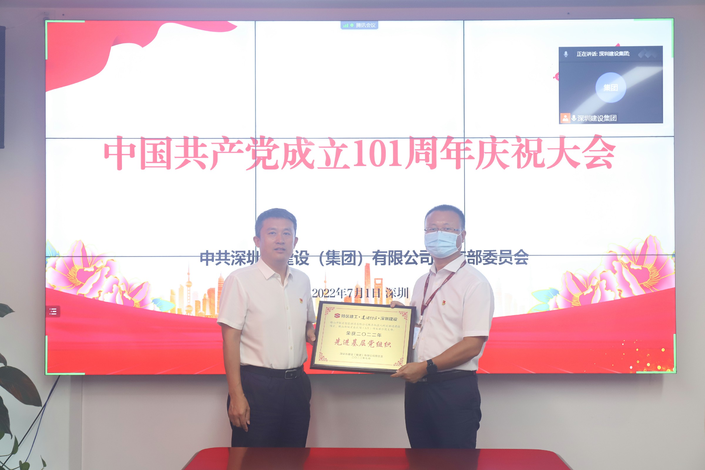 监事会主席彭志明同志宣读《深圳建设集团党总支关于表彰“先进基层党组织”“优秀党务工作者”“优秀共产党员”的决定》;集团领导为获得“优秀共产党员”称号的李廷刚、朱 丹、刘金想、杨国权、张炯华、郑 兰、 徐 魁、梁 鹏、曾祥旭、廖艳飞等10位同志颁发荣誉证书;黄海书记为获得“先进基层党组织”和“优秀党务工作者”的佛山市银星智能制造有限公司服务机器人 研发制造建设项目、佛山新城星盛花园(A区)项目联合党支部、崔森浩颁发荣誉证书。