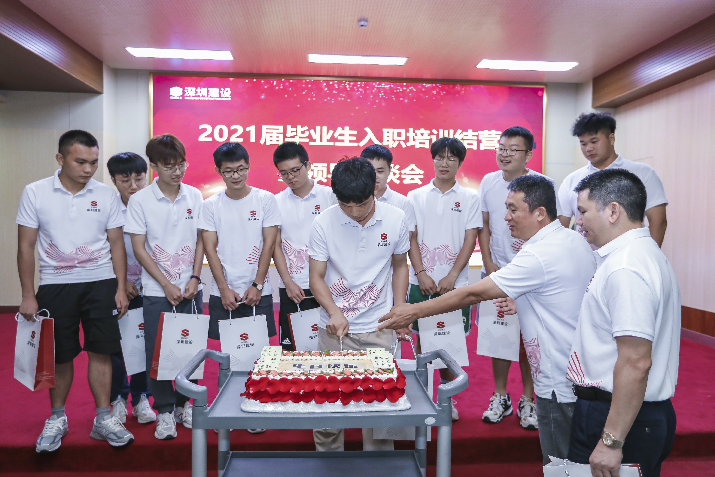 结营仪式演变成为嘉年华,8月份出生的新员工,得到一个大惊喜,集团为他们举办集体生日会!收礼物、切蛋糕,齐唱少年,齐唱《建设者之歌》,迎新活动圆满结营!