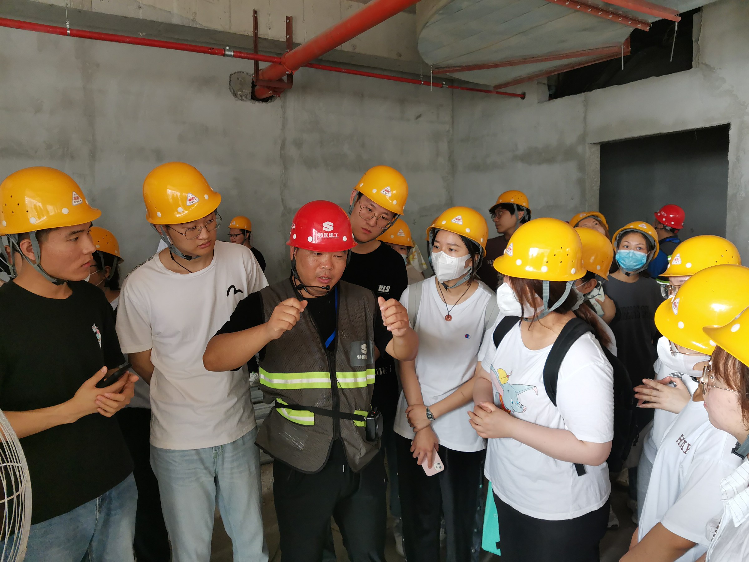 学生们分成上午下午各约160人开展实习活动。学生抵达项目后,由项目部总工对项目进行了简单的介绍,并对特区建工进行了宣传介绍。随后,学生们分成四个小组,分别由土建和安装各两个工程师带队,每组配备一名专职安全员和一名老师;每组在经过约一小时的现场参观讲解后,与另一专业组互换,确保每名学生都能分别得到土建和安装专业工程师的带领讲解。
